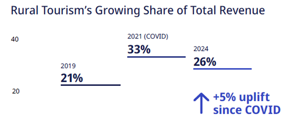 Segundo dados da Airbnb, as pesquisas por alojamento rural cresceram 100% em todo o mundo (abril de 2025) em comparação com o ano anterior, com um aumento de 50% nas pesquisas por alojamento em parques nacionais. Este crescente interesse é sustentado pelo facto de a natureza e as atividades ao ar livre estarem entre as três experiências mais procuradas pelos viajantes nacionais (41%) e internacionais (33%). Isto representa mudanças fundamentais nas preferências de destinos de viagem, favorecendo experiências que os destinos rurais estão bem posicionados para oferecer. Tais resultados demonstram a crescente procura pelo turismo autêntico e baseado na natureza que as zonas rurais naturalmente oferecem.