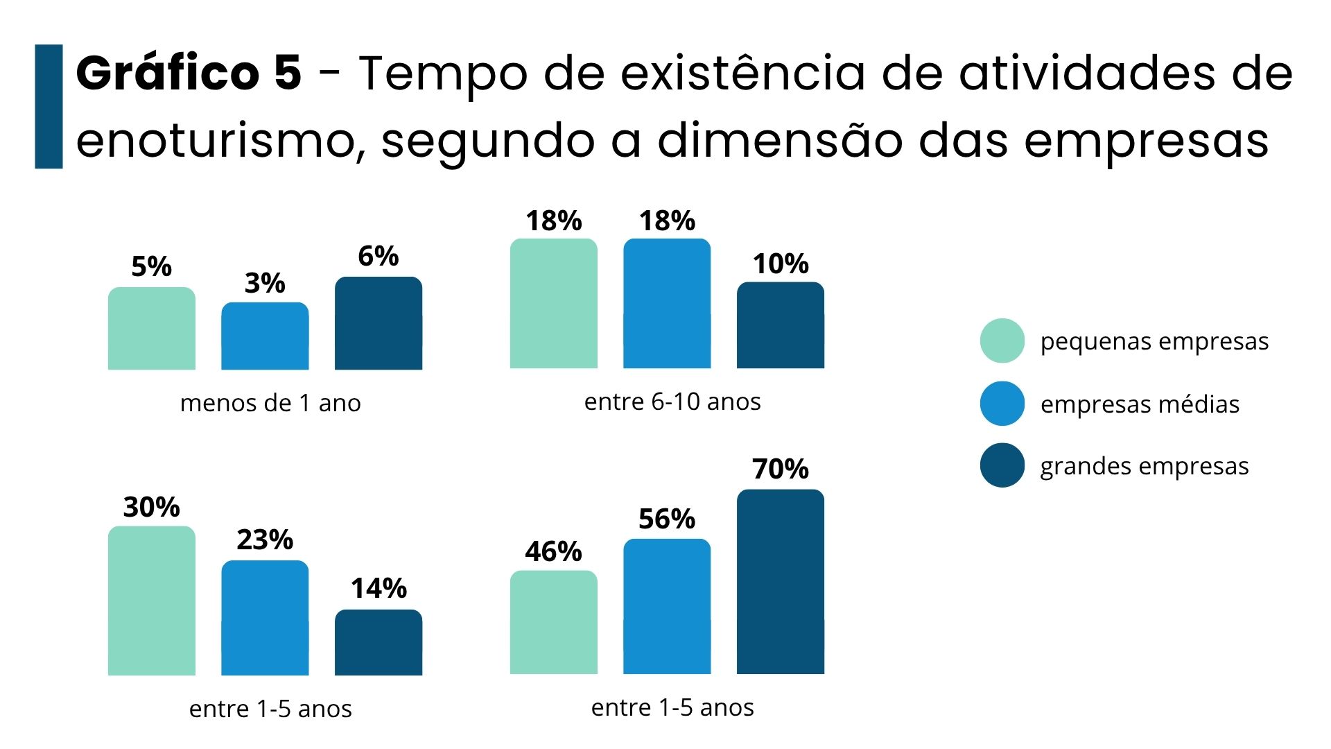 Outro aspeto analisado é o que relaciona a dimensão das empresas e o tempo em que estas têm vindo a oferecer atividades de enoturismo.. Embora a maior parte do conjunto de empresas inquiridas já tenha atividades de enoturismo há mais de 10 anos, a percentagem de respostas é mais alta quanto maior for a dimensão. Pelo contrário, das pequenas empresas, cerca de 35% entrou nesta atividade há menos de 5 anos.