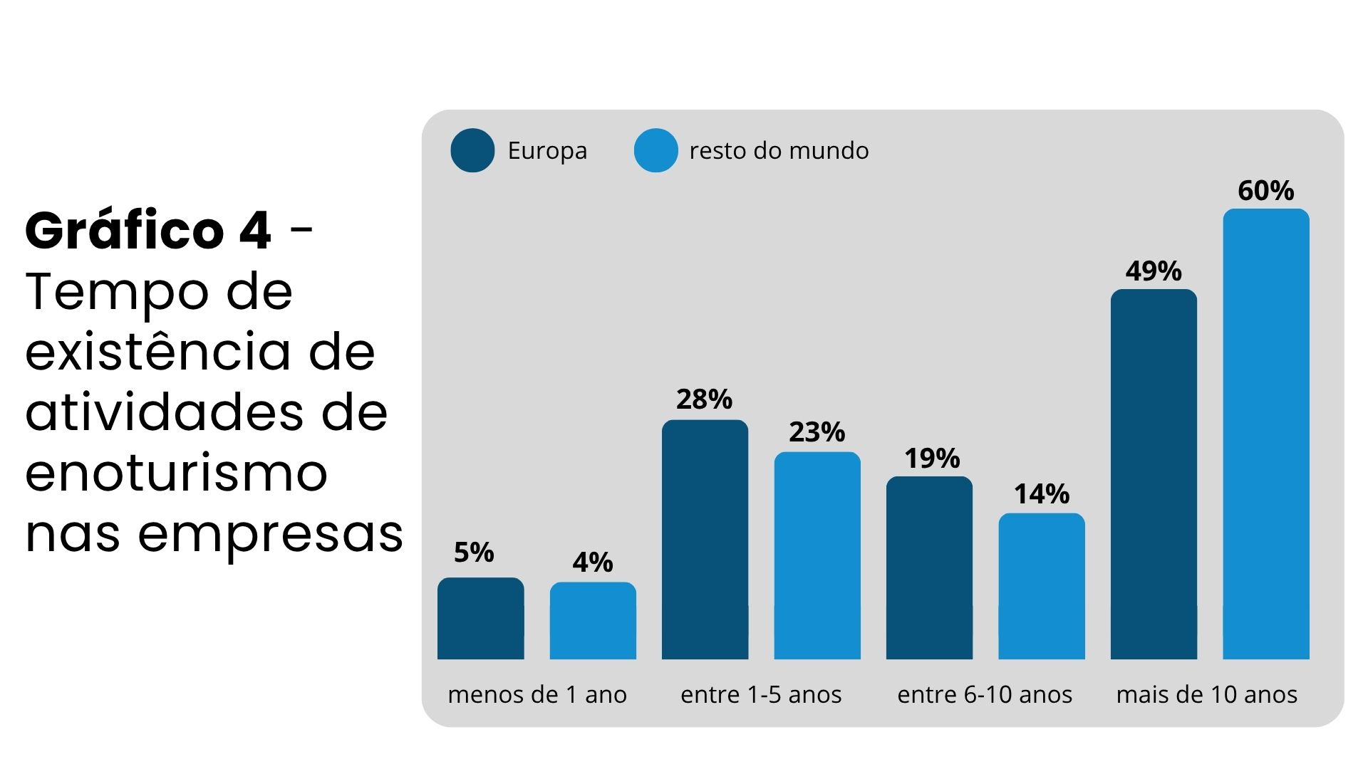 A maioria das adegas oferece enoturismo há mais de 10 anos, sendo essa proporção mais elevada nas regiões fora da Europa (60%) do que no continente europeu (49%).As adegas europeias apresentam quotas ligeiramente superiores nas categorias de 1 a 5 anos (28%) e 6 a 10 anos (19%) em comparação com outras regiões mundiais. Assim, os resultados sugerem que o enoturismo se desenvolveu primeiro noutras regiões mundiais e só mais tarde na Europa.