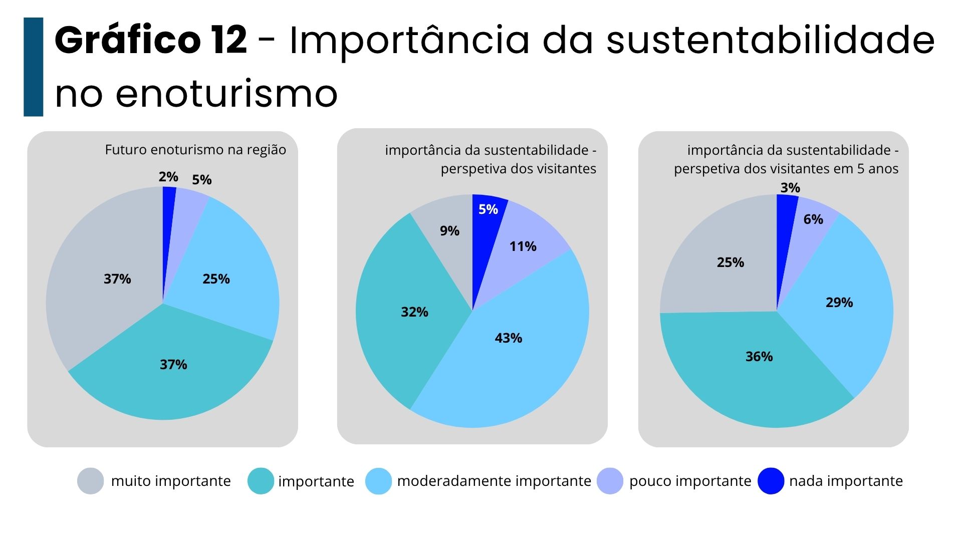 Curiosamente, ou não, a importância da sustentabilidade do enoturismo é bastante mais valorizada pelos produtores (67% consideram importante ou muito importante) do que pelos visitantes (apenas 41% considera importante). Espera-se que num futuro de médio prazo, nos próximos 5 anos, esta opinião possa ser partilhada por 61% dos visitantes.