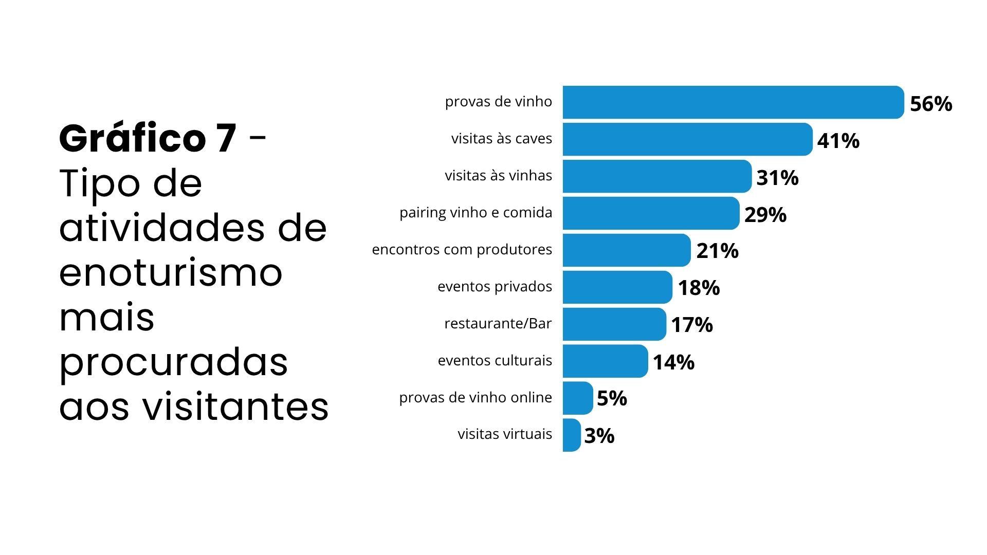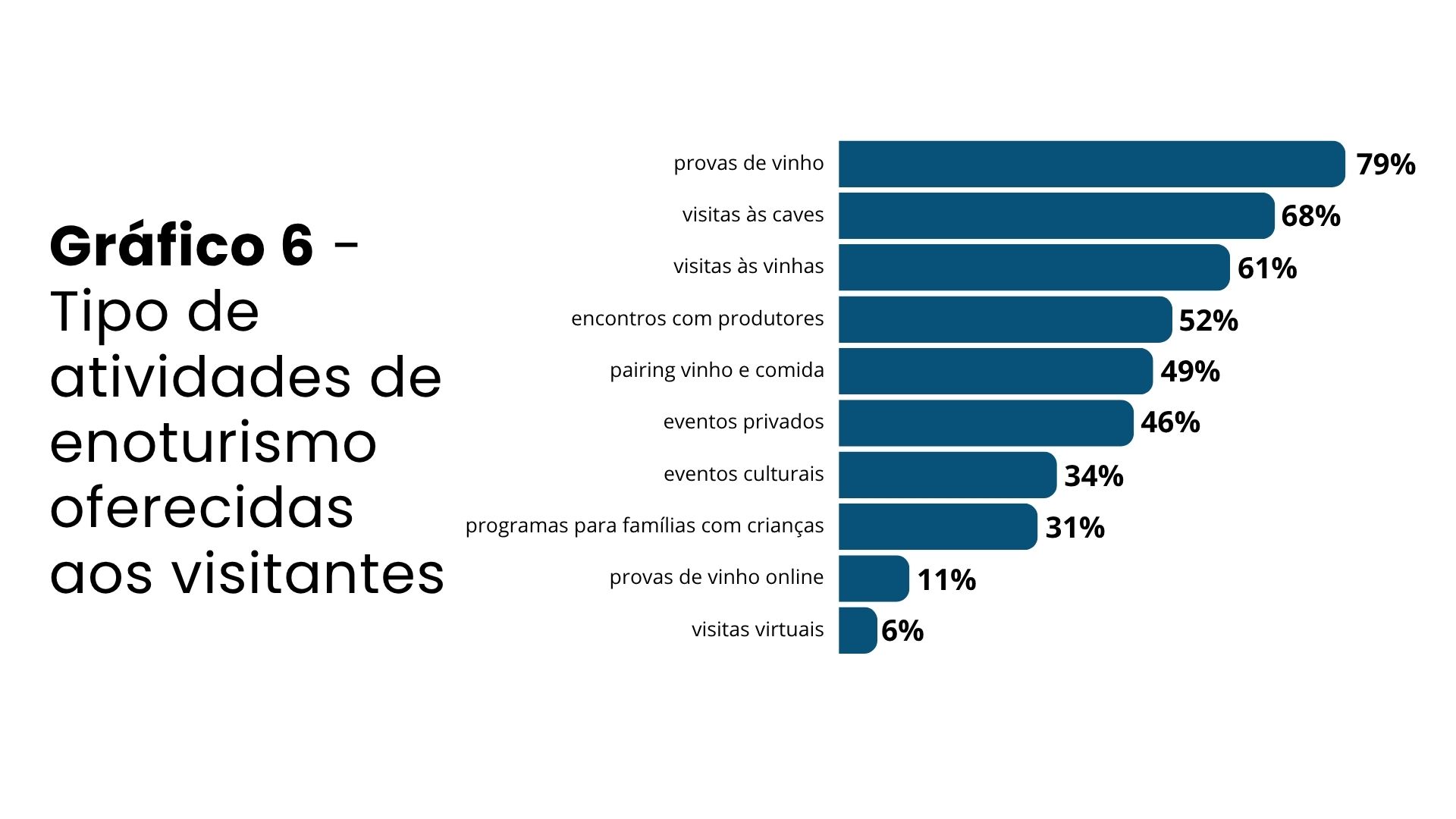 Já no que se refere ao tipo de atividades proporcionadas aos visitantes o top-3 é ocupado pelas provas de vinho (79%), visitas às caves (68%) e visitas às vinhas (61%). Experiências gastronómicas, designadamente pairings entre vinho e comida são oferecidos por metade das unidades respondentes (49%). Atividades de maior interação cultural, como encontros com os produtores ou eventos privados, também são bastante comuns (46%). Em contraponto, atividades conectadas com uso de tecnologia, como visitas virtuais (6%) ou provas online (11%) permanecem raras.