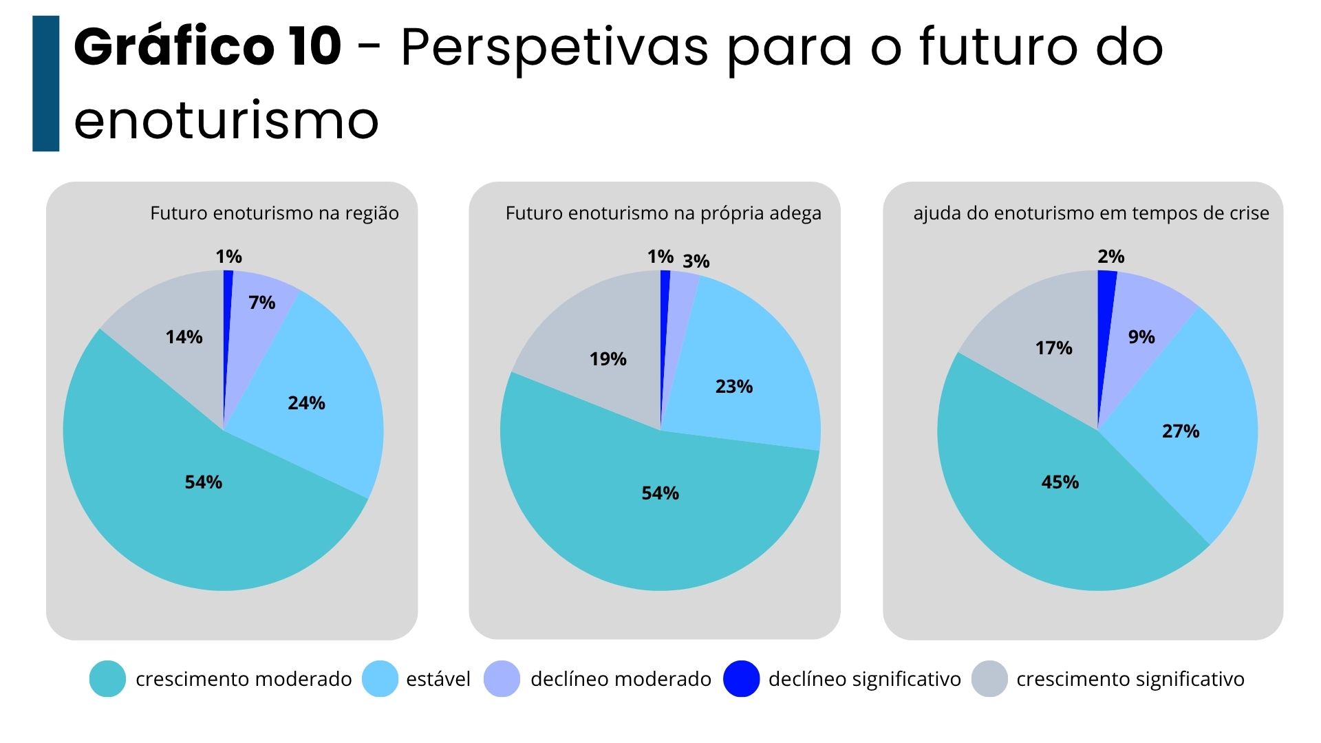 Quando inquiridas sobre o futuro do enoturismo em diferentes dimensões (região/ própria empresa/ajuda em tempos de crise) 68% acreditam que crescerá na sua região, 73% acreditam que as suas próprias atividades crescerão e 60% acreditam que poderão dar um contributo positivo em tempos de crise.
