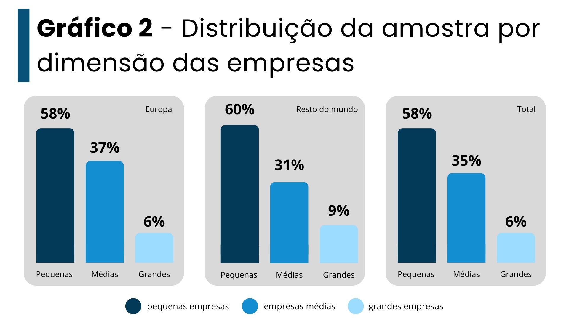 As empresas participantes são maioritariamente de pequena dimensão, enquanto as grandes empresas representam menos de 10% da amostra, não se registando grandes disparidade entre a Europa e o resto do mundo.