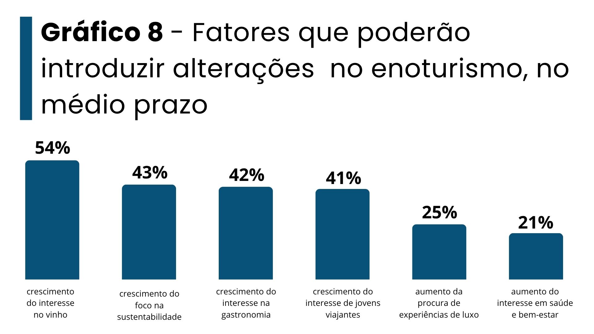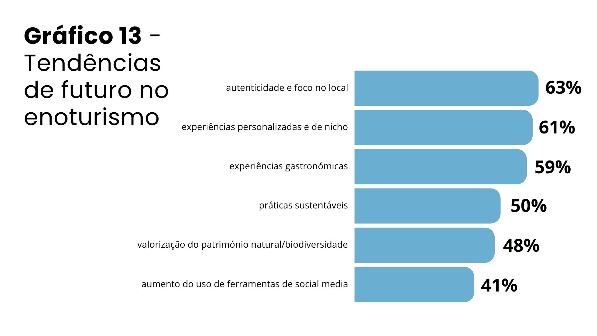 O conhecimento e domínio antecipado sobre os caminhos de futuro de qualquer atividade são da maior importância para investidores e empresários de qualquer área de negócio. O enoturismo não é exceção e nessa medida importa tentar perceber quais as tendências do futuro em termos de comportamento e preferências dos consumidores, regulamentação da atividade, ou desenvolvimento da situação económica. A autenticidade da experiência e o carácter local aparecem como principal fator crítico de sucesso (63% de referências), seguido das experiências personalizadas ou de nicho (61%) e do crescimento do interesse por experiências gastronómicas (59%). Um segundo grupo de tendências inclui a crescente procura por práticas sustentáveis (50%), interesse nos valores naturais e biodiversidade (48%) e a expansão da utilização de ferramentas de social media (41%). Aspetos mais tecnológicos como a utilização de informação sobre os clientes (data Analytics) ou a utilização de Inteligência Artificial para personalização das experiências são fatores menos considerados.