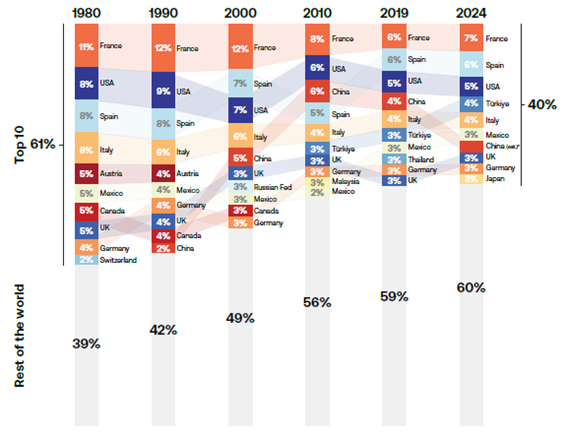 A crescente diversificação é visível não só ao nível regional, mas também na composição dos principais destinos turísticos mundiais. O peso relativo dos dez países mais visitados caiu de 61% das chegadas globais em 1980 para 40% em 2024.