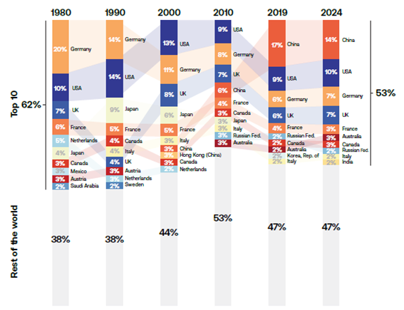 Também os mercados emissores mudaram substancialmente. Em 1980, mais de 60% das despesas globais eram feitas pelos dez principais mercados, predominantemente europeus e norte-americanos. Em 2024, representaram apenas 53%. A China tornou-se o maior mercado emissor mundial, e países como Austrália, Coreia do Sul, Índia, Arábia Saudita ou Rússia ganharam grande relevância.