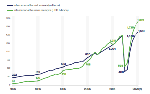 A expansão é igualmente visível ao nível das receitas do turismo internacional, que cresceram de cerca de 41 mil milhões de USD em 1975 para 1,9 biliões de dólares norte-americanos em 2025, um aumento aproximado de onze vezes em termos reais. Ao incluir as receitas do transporte internacional de passageiros, o total das exportações provenientes do turismo deverá atingir 2,2 biliões de dólares norte-americanos em 2025. Estes números demonstram a crescente importância económica do turismo como fonte de receitas externas para países de todas as regiões.