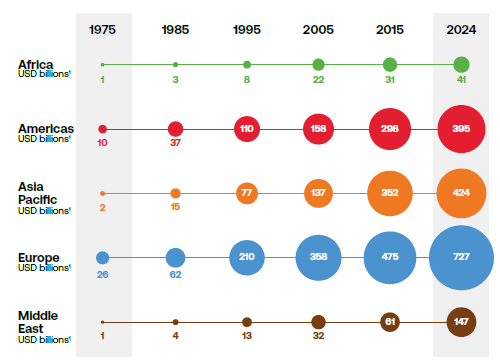 Figura 5 - Evolução das receitas turísticas internacionais, por região, 1975-2025