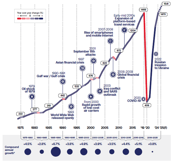 Ao mesmo tempo, o setor demonstrou uma resiliência excecional face a diferentes tipos de crises. Antes da pandemia de 2020, as quebras anuais globais raramente superaram os 4%. Fenómenos como os atentados de 11 de setembro, a crise financeira de 2009, surtos epidémicos regionais (SARS, Ebola, Zika) e conflitos geopolíticos tiveram impactos limitados no volume global de viagens.