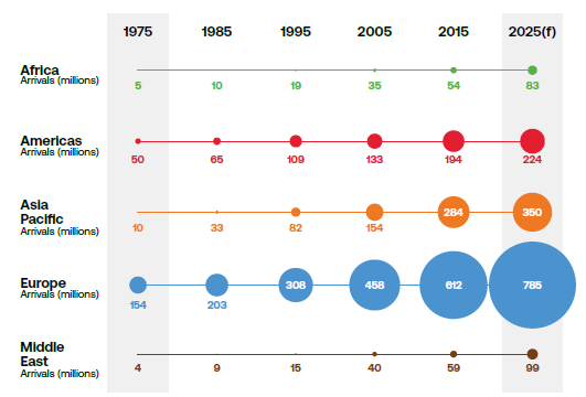 Em 1975, Europa e Américas representavam 92% das chegadas internacionais. Em 2025, deverão representar apenas 66%, como resultado do crescimento particularmente rápido de outras regiões.