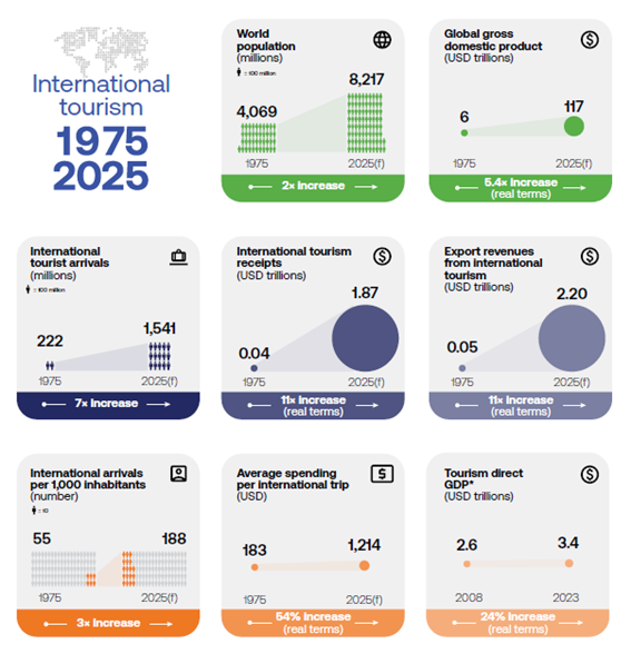 Entre 1975 e 2025, o mundo assistiu a um crescimento extraordinário do turismo internacional. As chegadas de turistas internacionais passaram de 222 milhões para 1,5 mil milhões, o que representa uma aproximada multiplicação por 7! Durante o mesmo período, a população mundial duplicou, mas o crescimento do turismo ultrapassou largamente esse ritmo, evidenciando uma procura crescente por viagens internacionais e um aumento significativo na acessibilidade global ao turismo.