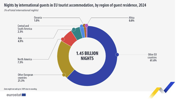 A maioria das dormidas turísticas provém de viagens domésticas e intra-EU, ou seja, a maior parte das 3 mil milhões de dormidas na UE foram realizadas por hóspedes nacionais dos seus respetivos países (51,9%; 1,57 mil milhões), enquanto os restantes 48,1% (1,45 mil milhões) foram realizados por hóspedes internacionais.