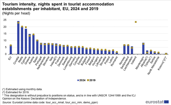Em termos de intensidade turística, o espaço europeu registou um valor médio de 6,7 noites por hóspede, por ano, em relação à população total de 449,3 milhões de residentes na UE em 2024. Este valor foi ligeiramente superior ao registado cinco anos antes, em 2019, quando a intensidade turística na UE era de 6,4 noites por habitante. Neste indicador a Croácia (com 24,2 noites), Malta (com 20,1 noites) e Chipre (com 18,5 noites) registaram os maiores números de noites por habitante ao longo de 2024.