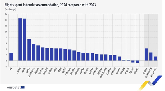 Entre os países da UE, Chipre e Malta registaram o maior crescimento homólogo nas dormidas turísticas, com aumentos de 14,5% e 14,4%, respetivamente. A Letónia seguiu-os de longe, registando uma taxa de crescimento de 7,4% em relação a 2023.