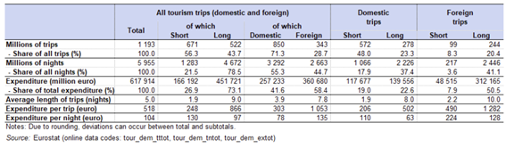 Como principais aspetos destaca-se que em 2024, os residentes na UE com 15 anos ou mais realizaram quase 1,2 mil milhões de viagens turísticas, com uma duração média de 5 noites por viagem. No total destas viagens, 56,3% foram de curta duração (1 a 3 noites), enquanto os restantes 43,7% foram de viagens com duração de pelo menos 4 noites. Os europeus tendem a fazer um maior número de viagens dentro do seu próprio país, o que teve como resultado que quase 3 em cada 4 viagens foram nacionais, onde passaram, em média, 4 noites. Nas viagens ao estrangeiro, a duração da estadia foi mais longa, 8 noites em média.
