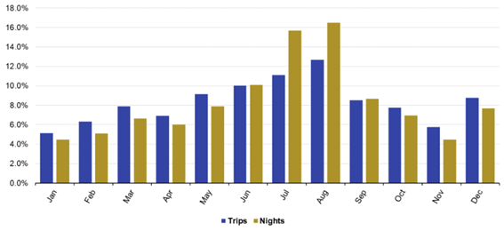 Considerando que a principal e, normalmente, mais longa viagem do ano é maioritariamente feita no verão, o padrão sazonal tornou-se ainda mais evidente quando se analisa o número de noites. Os residentes na UE passaram uma em cada três noites fora de casa nestes dois meses: julho (15,7%) e agosto (16,5%). O número de noites no mês de maior procura (agosto) foi 3,7 vezes superior ao número de noites no mês de menor procura (novembro).