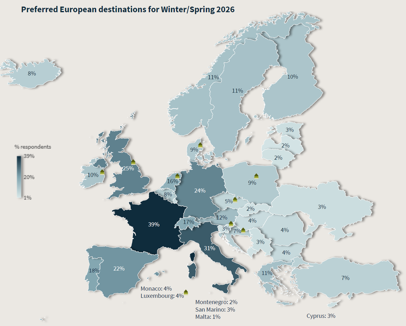 Um outro aspeto em destaque neste relatório é a identificação dos países potencialmente alvo da preferência dos viajantes não europeus para este período de inverno-primavera. Neste ponto a França e a Itália lideram as preferências e Portugal continua, solidamente, a fazer parte do Top-10 de preferências (6.º), concentrando cerca de 18% das preferências destes viajantes.